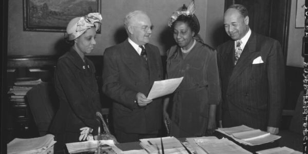 Los Angeles Mayor Fletcher Bowron, alongside Our Authors Study Club founder Vassie D. Wright (center), proclaims the first official celebration of Negro History Week (the precursor to African American History Month) in Los Angeles, with Evangeline Woodfolk and Reverend Baxter Duke present as onlookers.